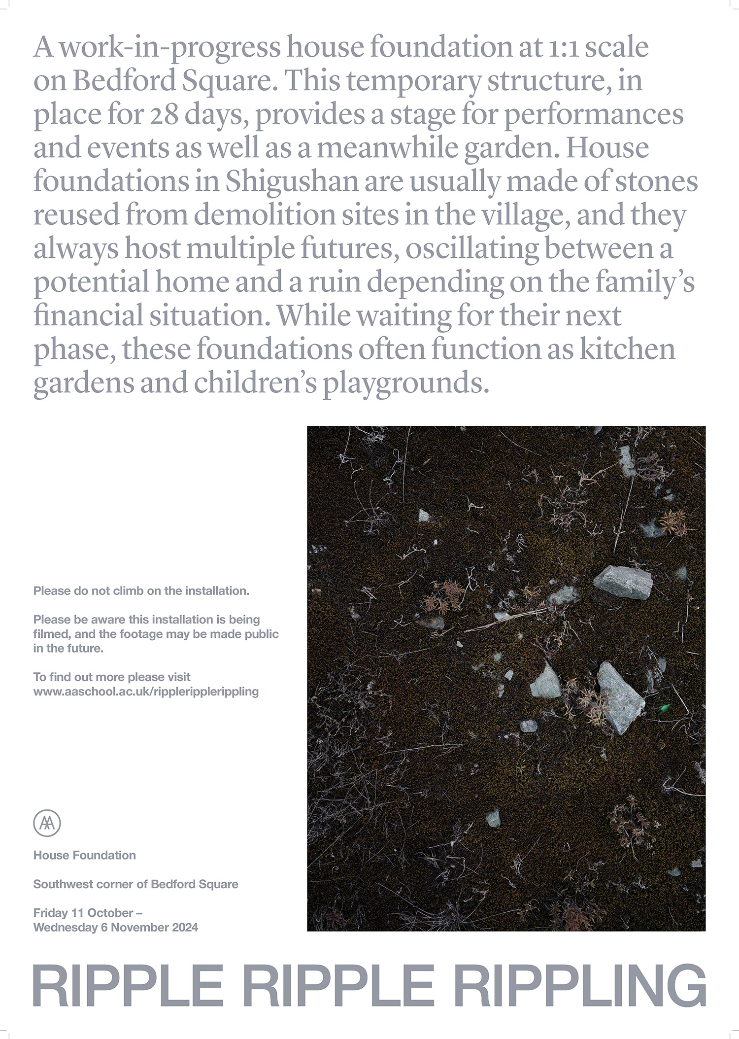 After a journey that has expanded outwards from architecture, the exhibition at the AA is a moment of homecoming to the place where this project originally began.A work-in-progress house foundation at 1:1 scale on Bedford Square juxtaposes a key material register of the complex social and economic conditions in the village onto this privately-owned public space in central London – all while providing a stage for performances and food-sharing as well as a living garden. The corresponding exhibits in the AA Gallery include a walk-around screening of the Ripple Ripple Rippling film trilogy, and multimedia storytelling that brings together drawings, photographs and field footage.